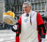 The Inter-Livery Pancake Race is a vibrant event held annually in Guildhall Yard, London on Shrove Tuesday. It is organised by the Worshipful Company of Poulters and features teams from various City Livery Companies competing in a pancake-flipping race. This year, the Race, held on 17 February, once again delivered all the colour, camaraderie, and good humour that make it a highlight of the City calendar. The Company was proudly represented, with Malcolm McCaig competing in the Masters’ Race, Jim Foster taking part in the Liverymens' Race and Olga Croft flying the flag in the Ladies’ Race.